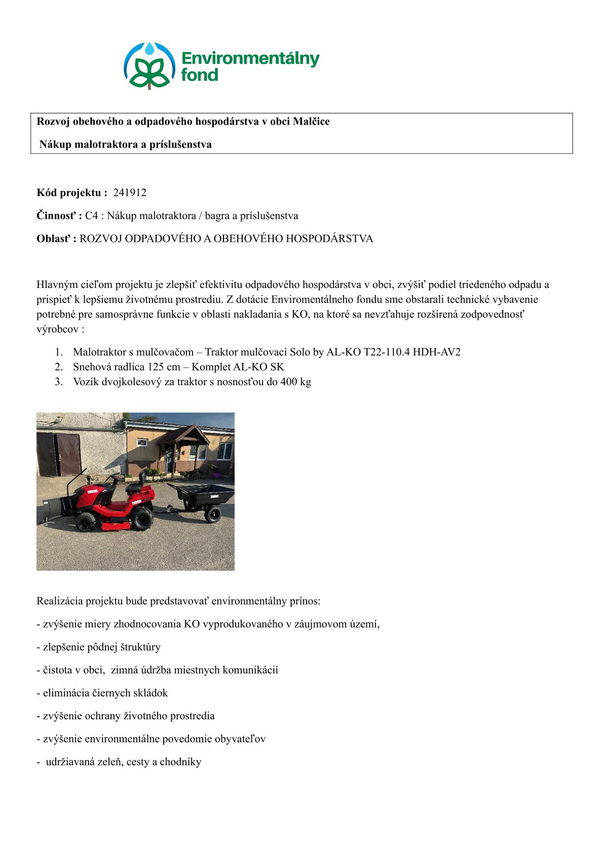 Rozvoj obehového  a odpadového hospodárstva v obci Malčice- nákup malotraktora Rozvoj obehového a odpadového hospodárstva v obci Malčice- nákup malotraktora